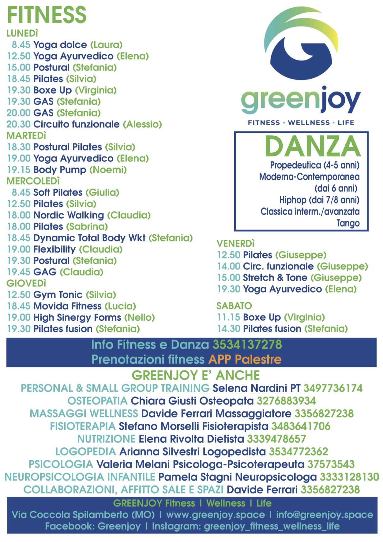 Scuola di danza, corsi fitness, personal & small group training, massaggi, osteopatia, fisioterapia, spazi per tante altre attività. Greenjoy è fitness, wellness, life, a 360°!